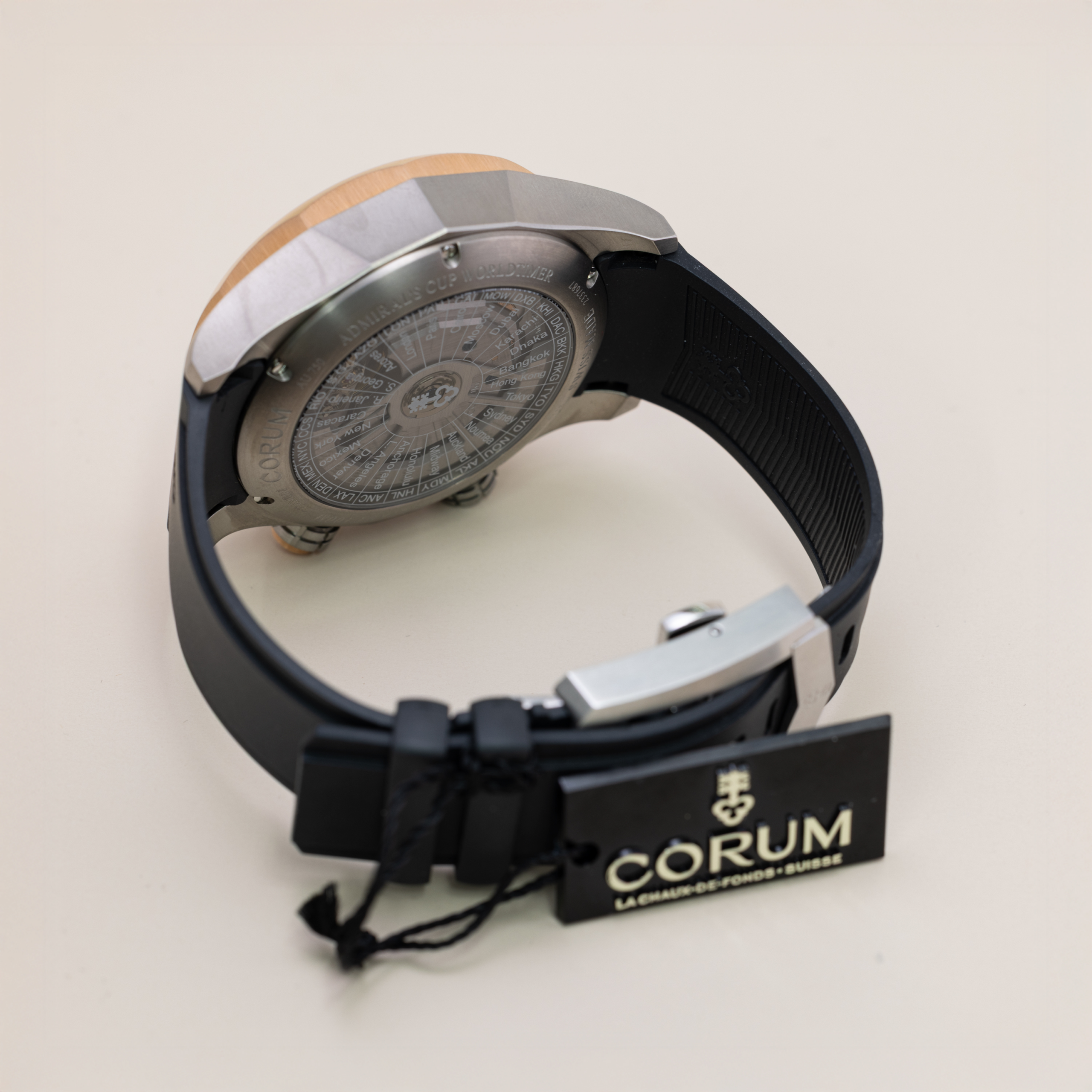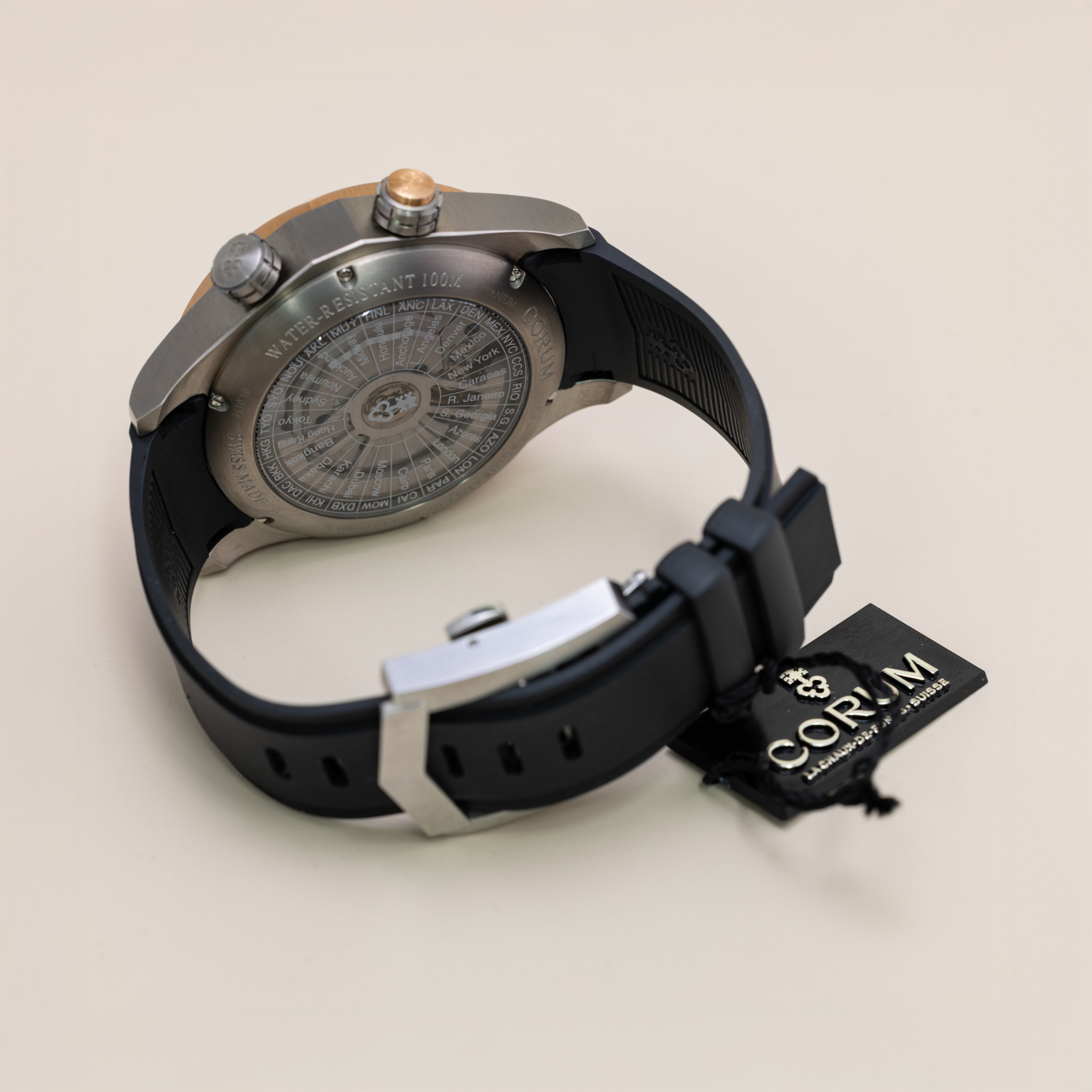 Montre automatique GMT, lunette or rose 18 kt, boitier titane grade 2. GMT à 9h, indication de la ville à 3h. Indicateur jour-nuit. Index drapeaux nautiques. Heures, minutes, secondes. Aiguilles luminescentes. Cadran squelette noir. Réserve de marche 48h. Fond transparent en verre saphir fumé avec indication de la ville pour chaque fuseau horaire. Couronne vissée. Boucle déployante triple enacier inoxydable
