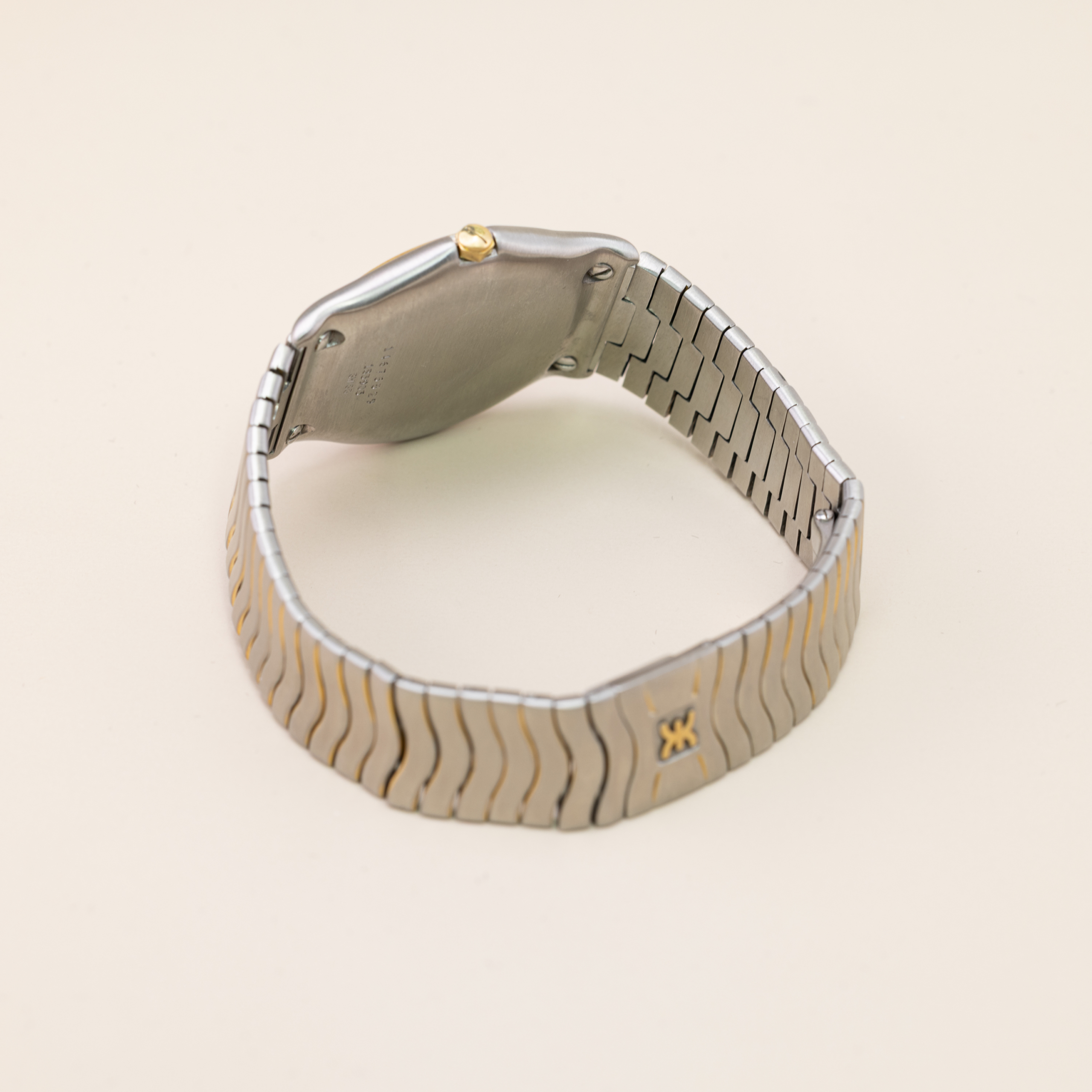 Montres à quartz, heures minutes, secondes. Aiguilles et index dorés, chiffres romains. Date à 3h. Bracelet acier et or, lunette en or 18kt