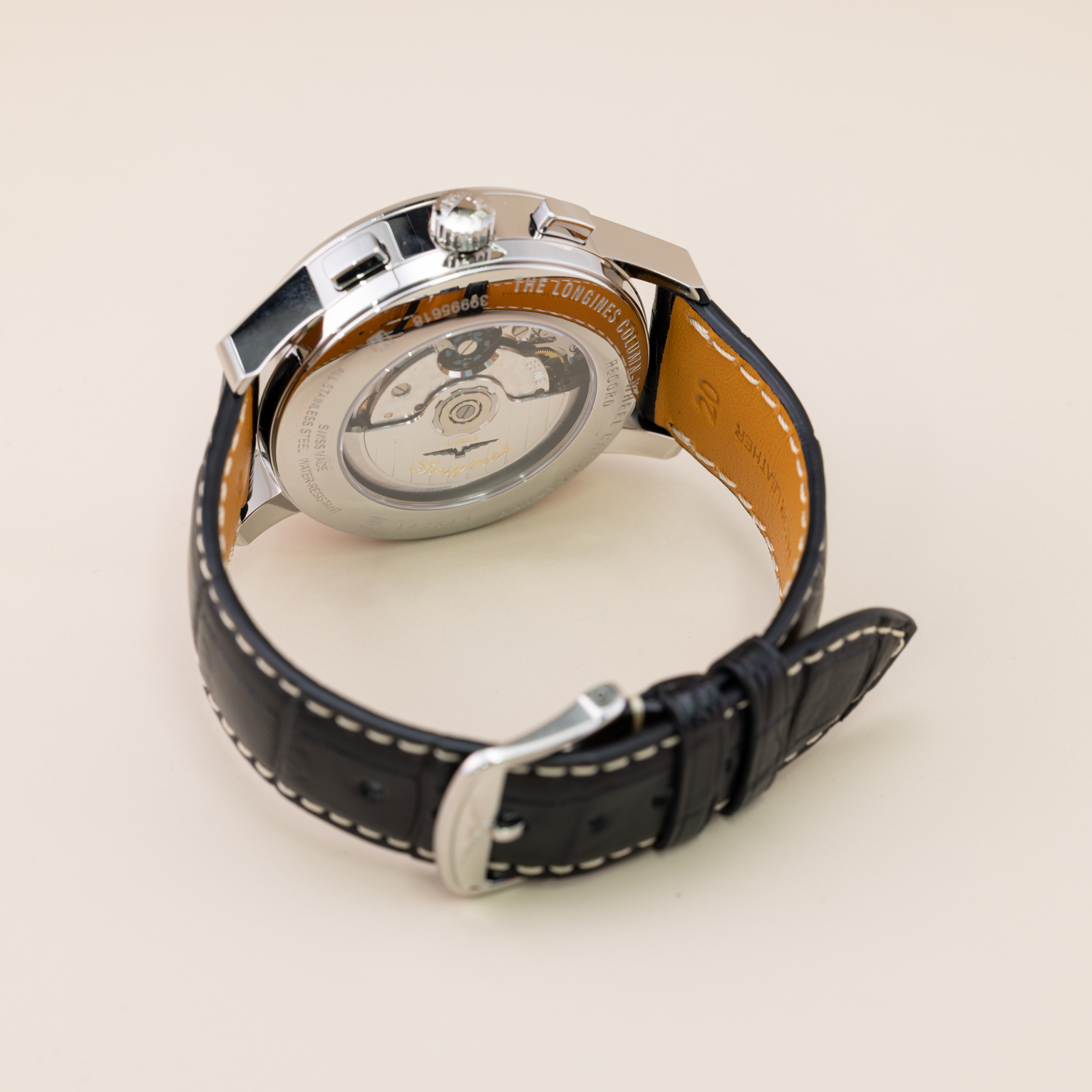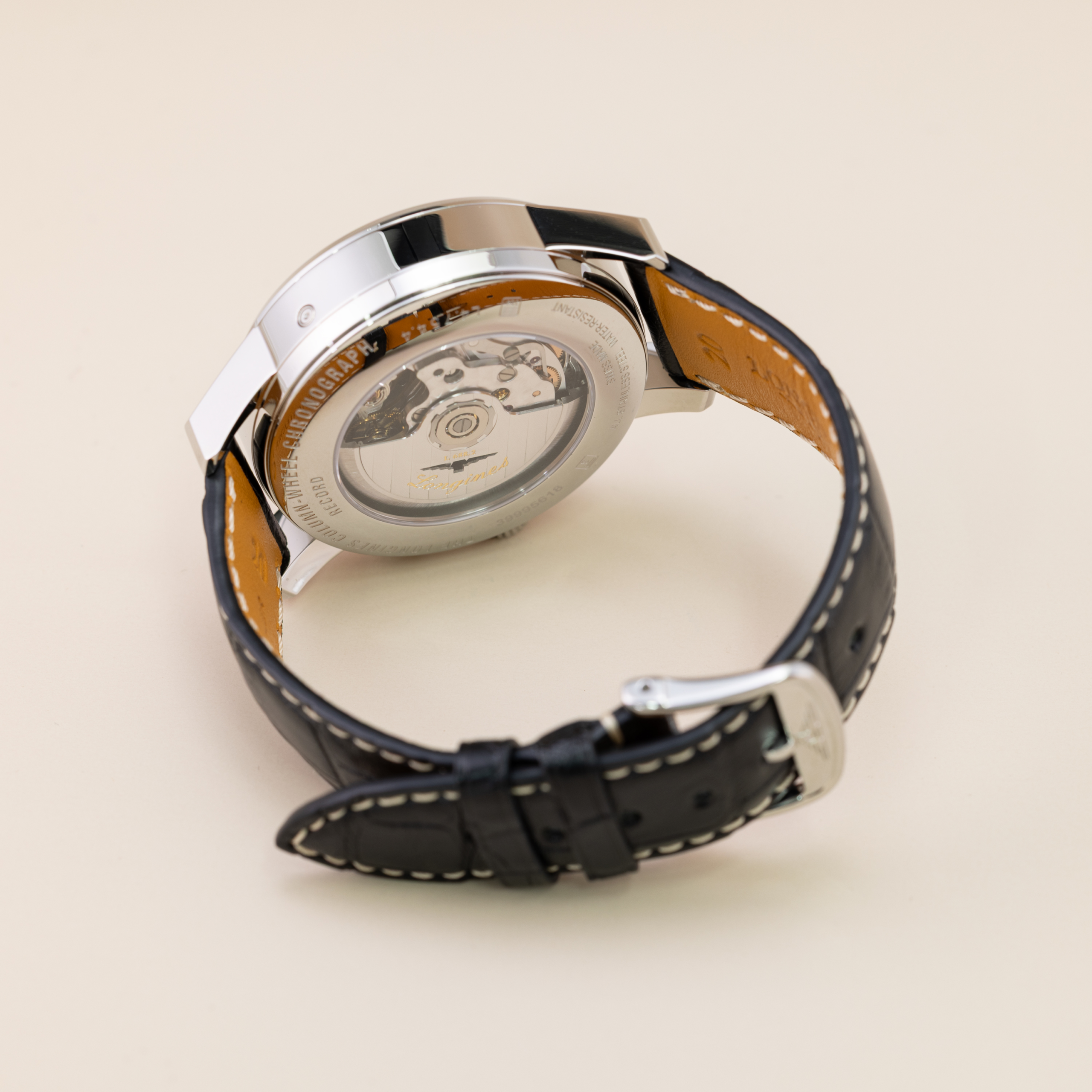Chronographe automatique, heures, minutes, secondes. Aiguilles et index luminescents. 3 compteurs: 30 minutes à 3h, 12 heures à 6h, petite seconde à 9h, date à 16h. Chronographe roue à colonne. Fond transparent